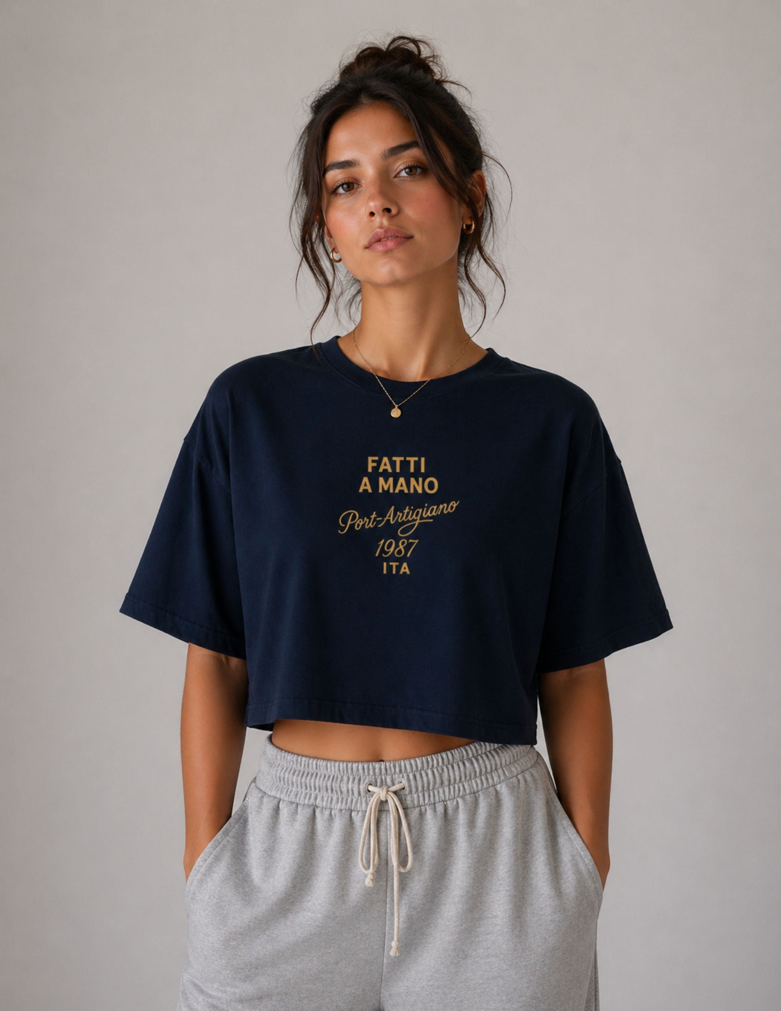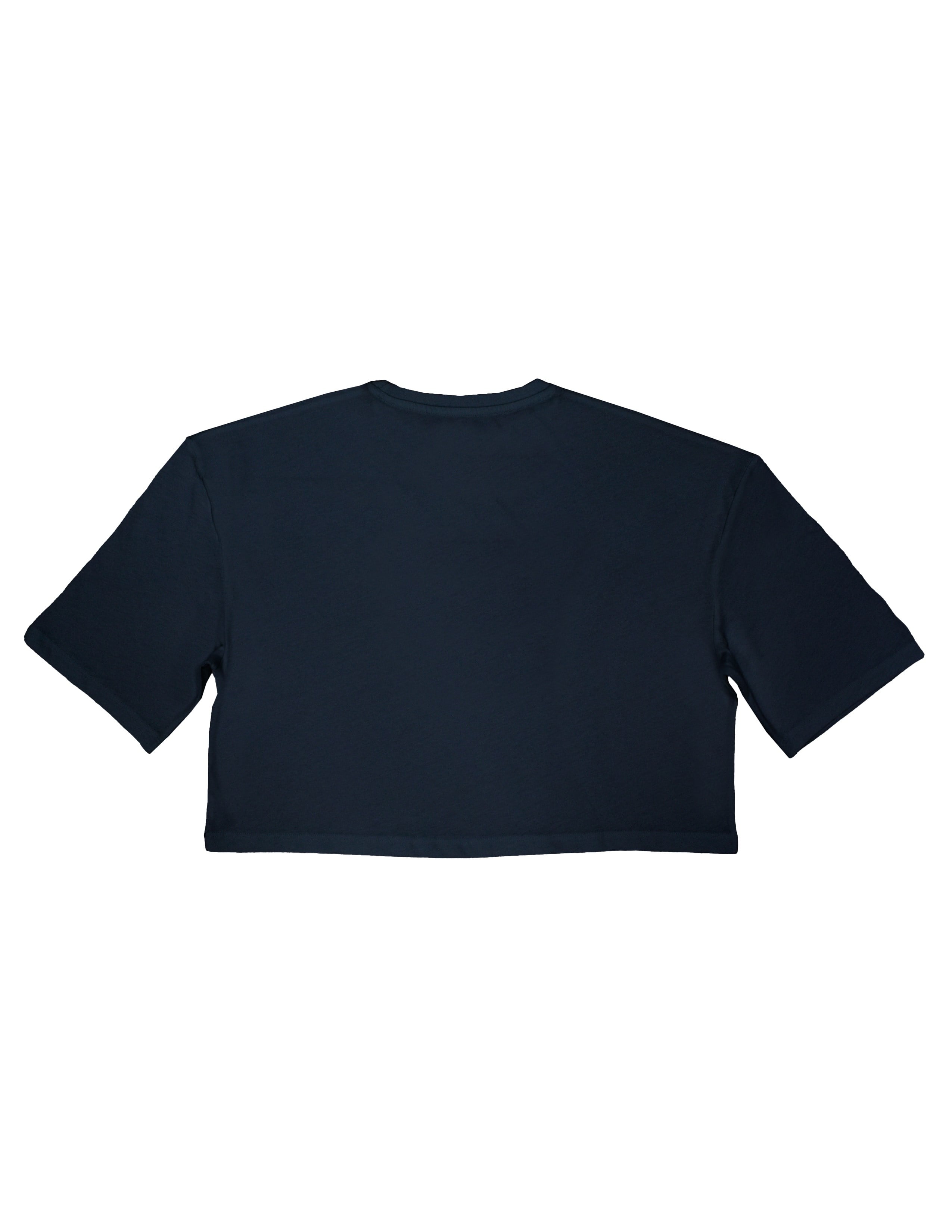 Lacivert,baskılı,bisiklet yaka, kısa kollu loose crop fit t-shirt. GOTS organik sertifikalı süprem kumaş. Maksimum 30°C sıcaklıkta benzer renklerle yıkayınız. Kumaş İçerik: %100 Organik Pamuk