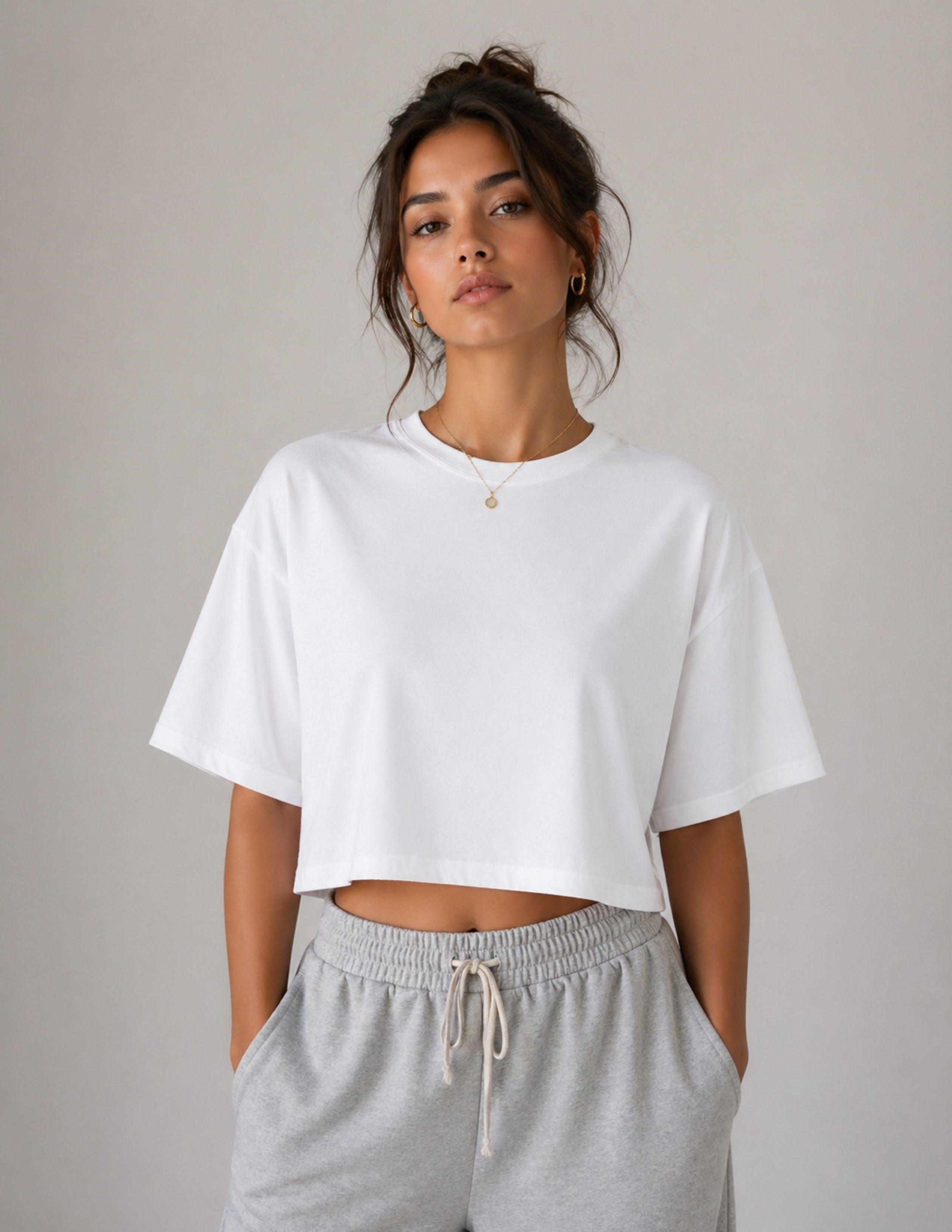 Beyaz,bisiklet yaka, kısa kollu loose crop fit t-shirt. GOTS organik sertifikalı süprem kumaş. Maksimum 30°C sıcaklıkta benzer renklerle yıkayınız. Kumaş İçerik: %100 Organik Pamuk