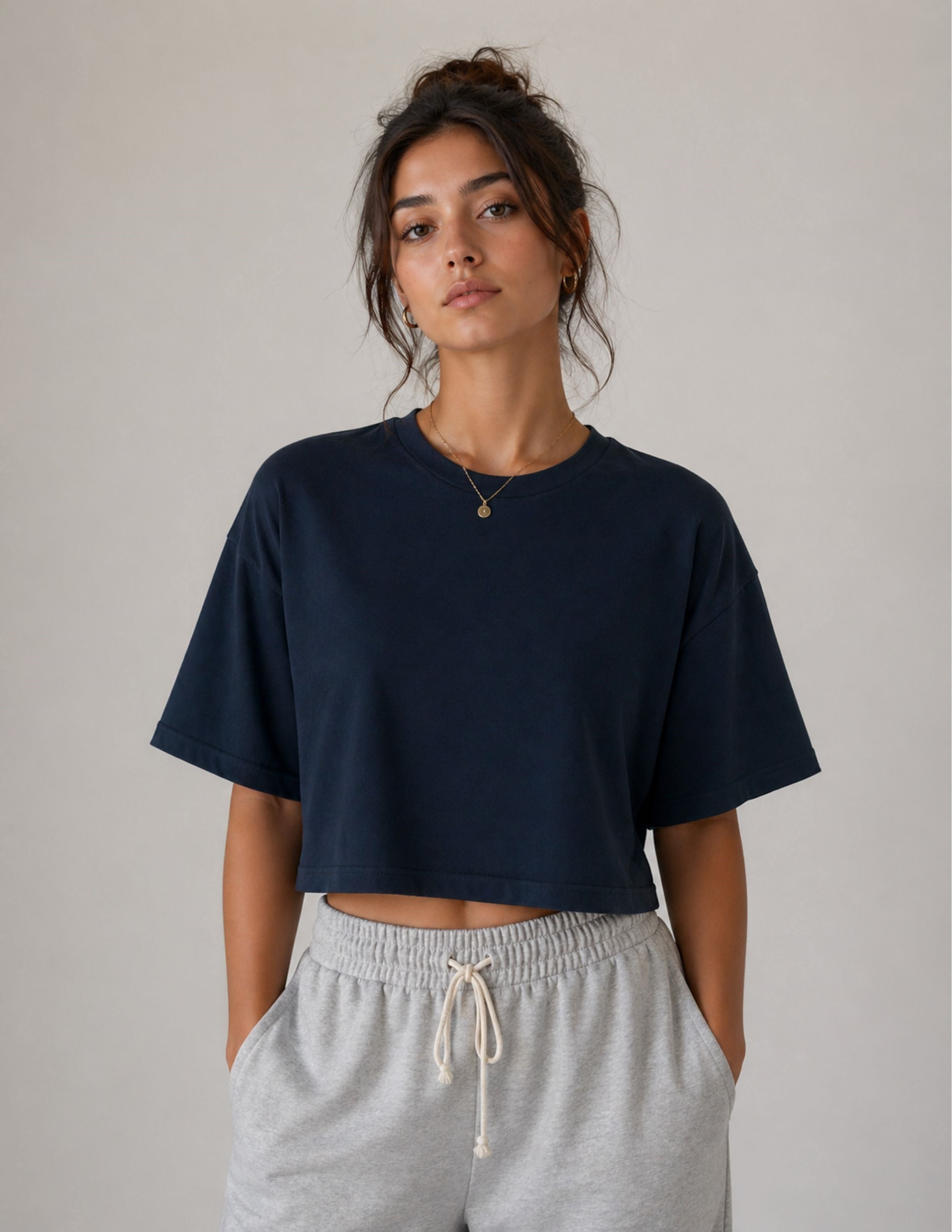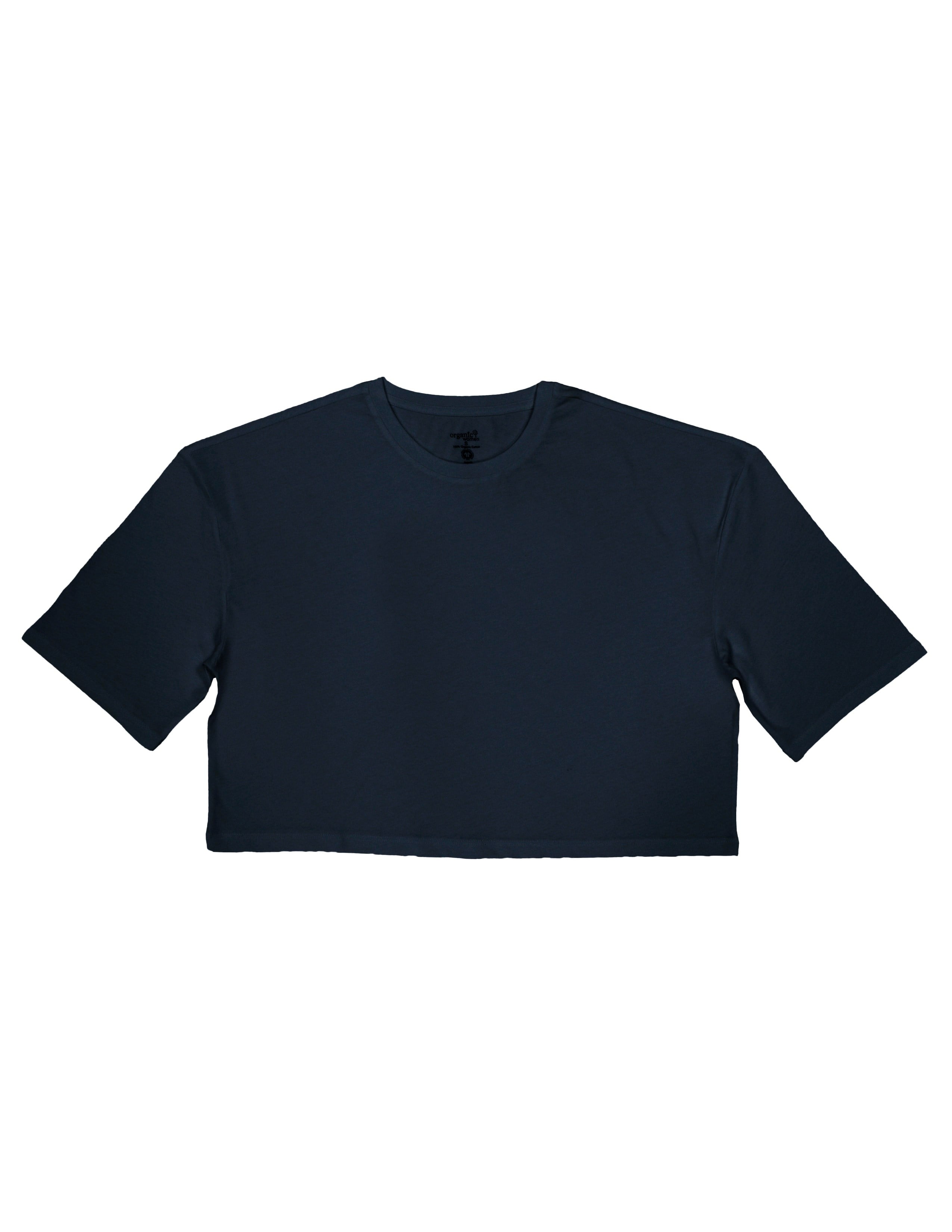 Lacivert,bisiklet yaka, kısa kollu loose crop fit t-shirt. GOTS organik sertifikalı süprem kumaş. Maksimum 30°C sıcaklıkta benzer renklerle yıkayınız. Kumaş İçerik: %100 Organik Pamuk