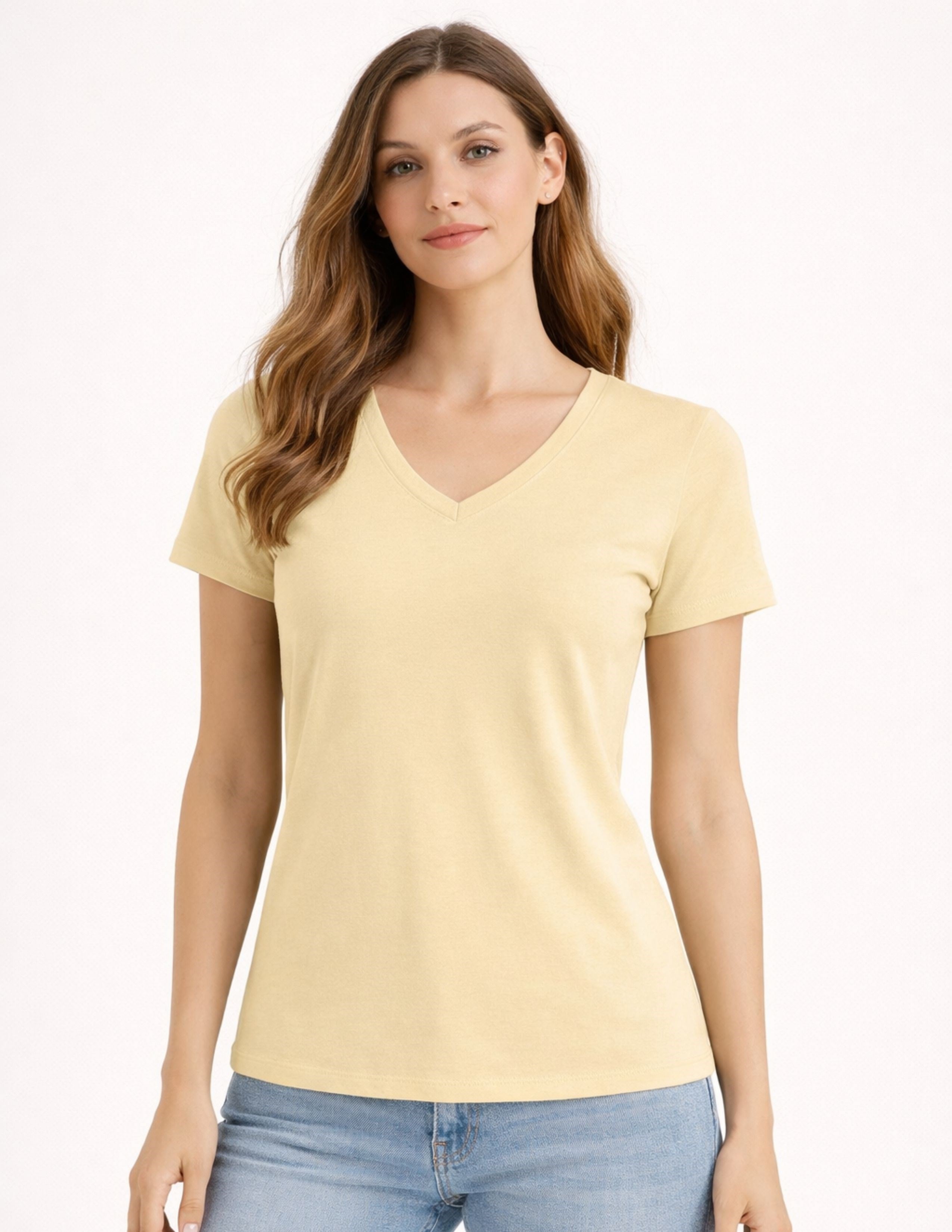 Basic Kadın V Yaka Semi-Fitted Bej T-shirt (4008700420)