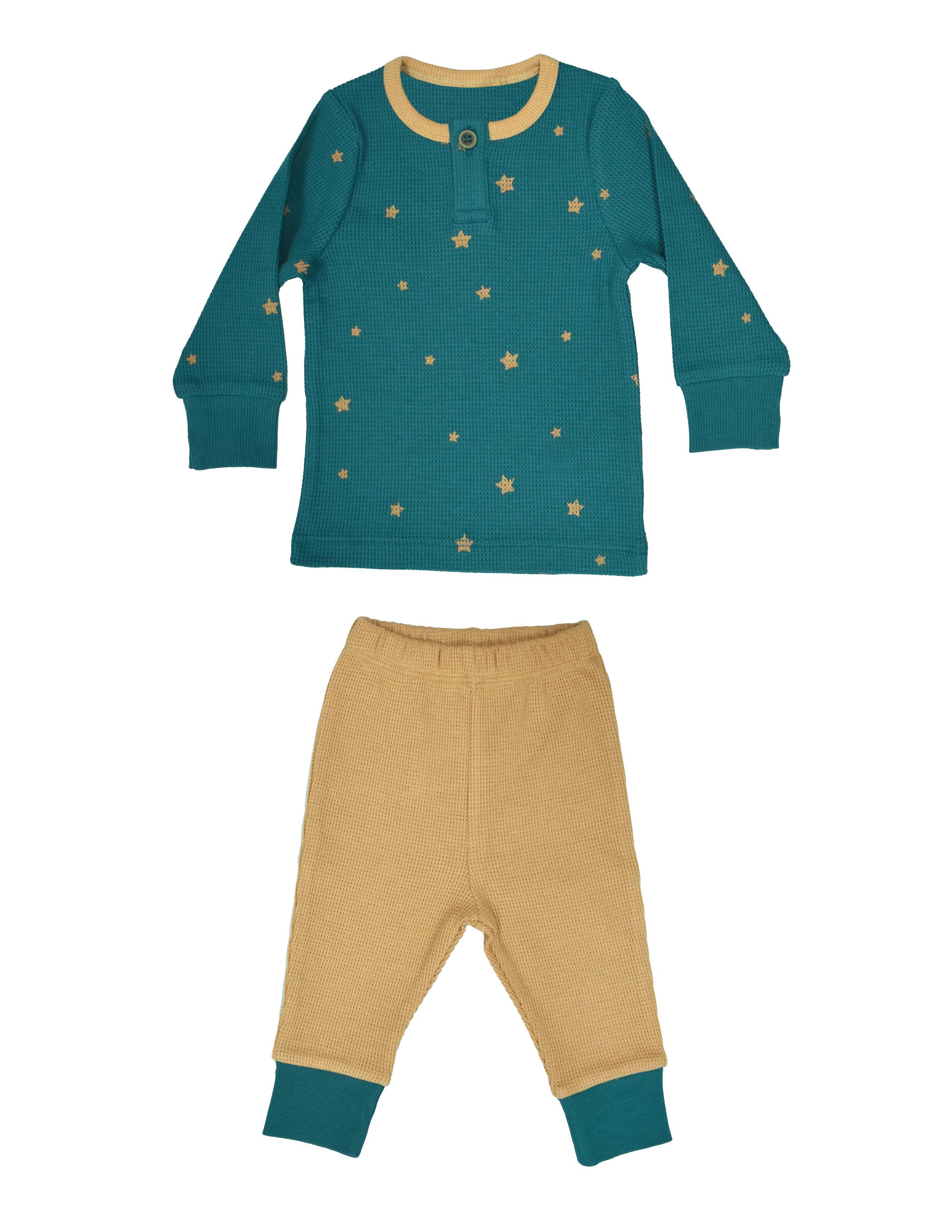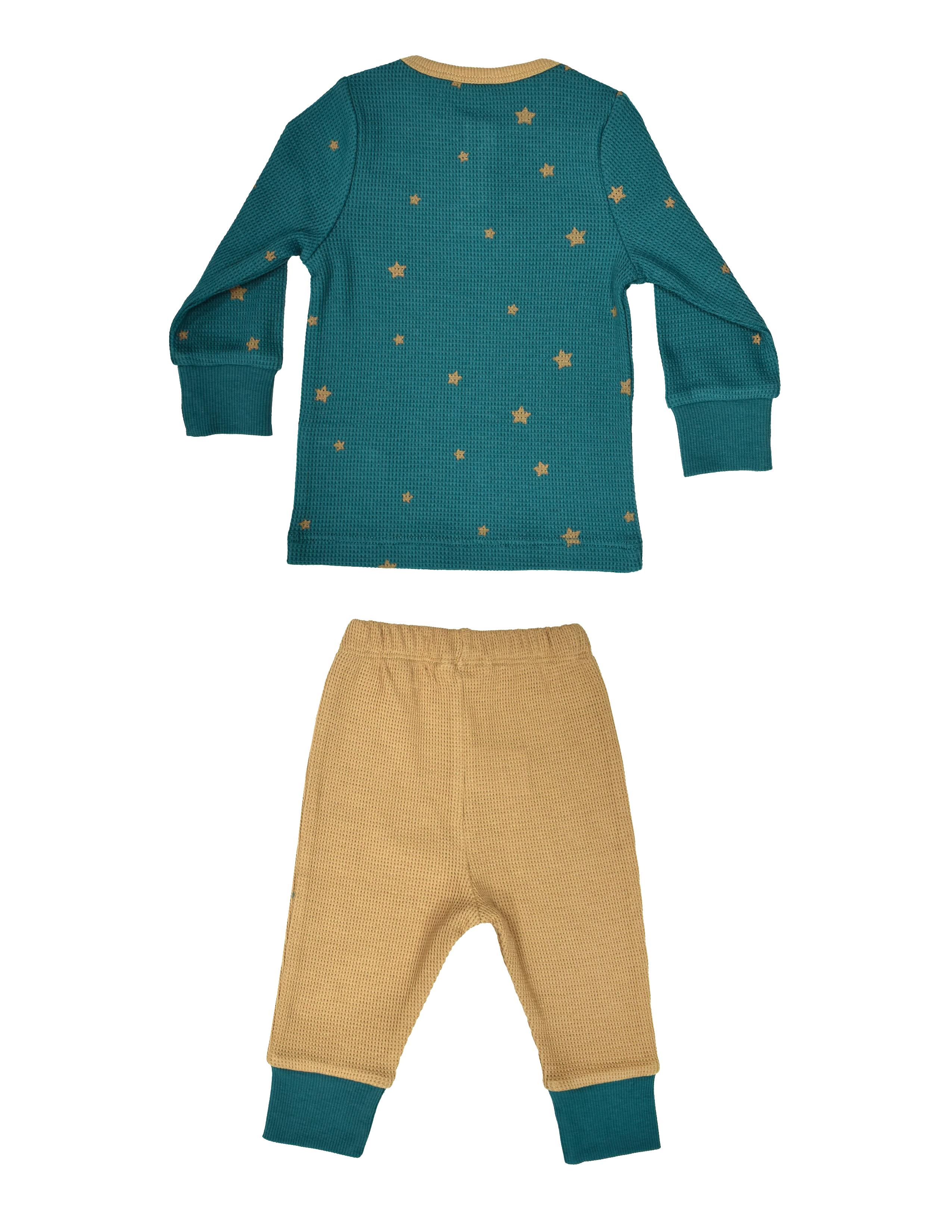 Petrol mavi baskılı uzun kollu, önü patlı bebek üst ve bej renk alt pijama takımı. GOTS organik sertifikalı waffle kumaş. Maksimum 30°C sıcaklıkta benzer renklerle yıkayınız. Kumaş İçerik: %95 Organik Pamuk %5 Likra.