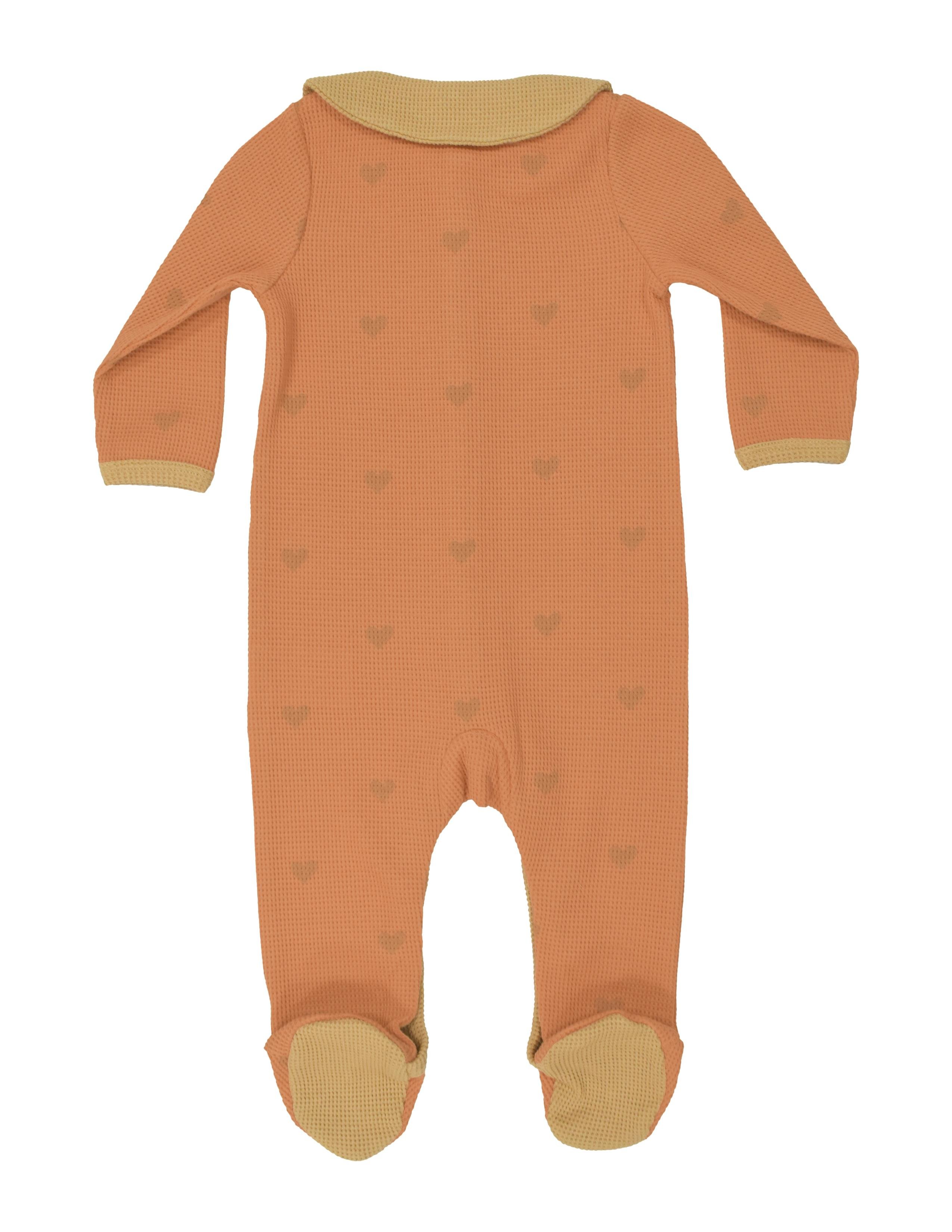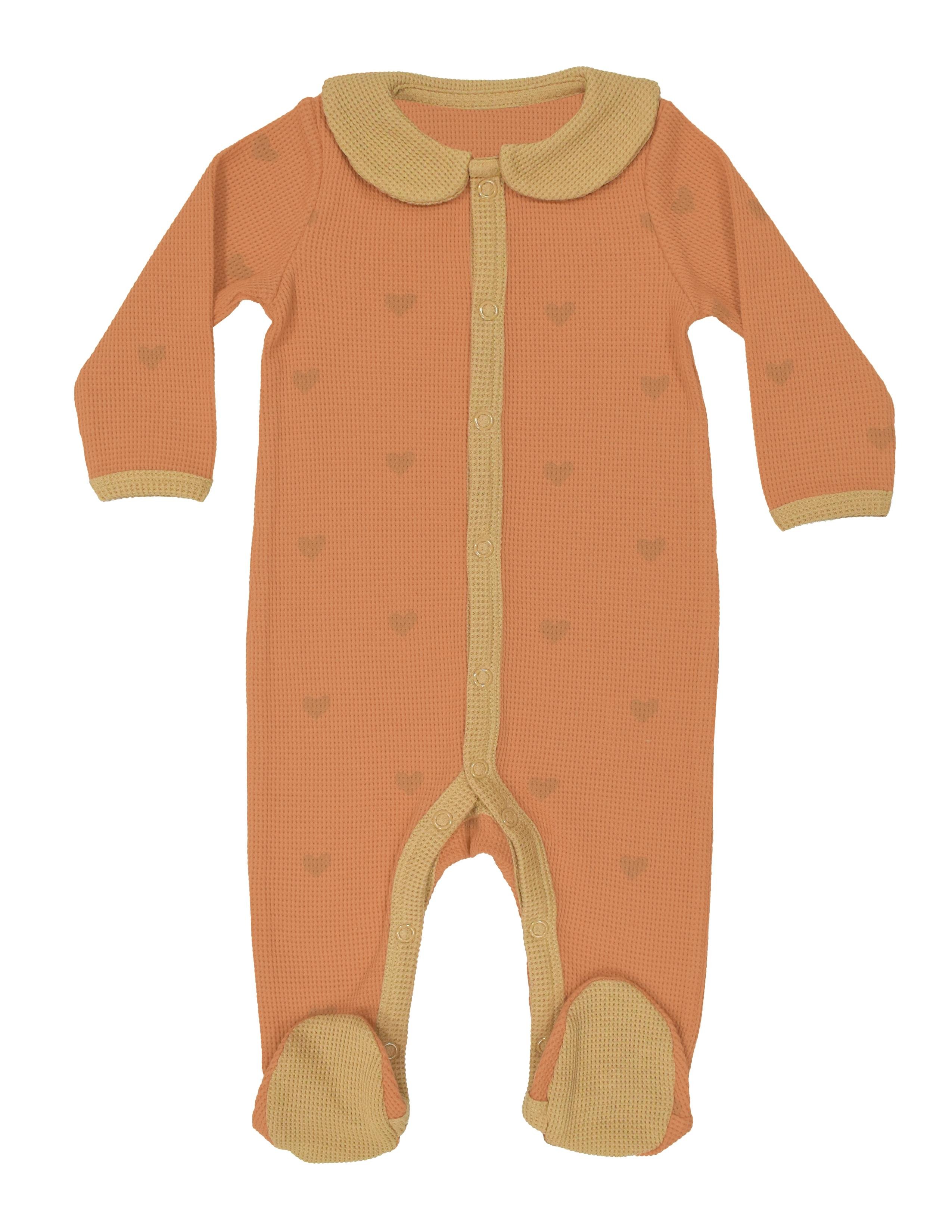 Kiremit,baskılı,önden çıtçıtlı ayaklı tulum. 12-18 ve 18-24 ay bedenleri ayaksız olarak üretilmiştir. GOTS organik sertifikalı waffle kumaş. Maksimum 30°C sıcaklıkta benzer renklerle yıkayınız. Kumaş İçerik: %95 Organik Pamuk, %5 Likra.