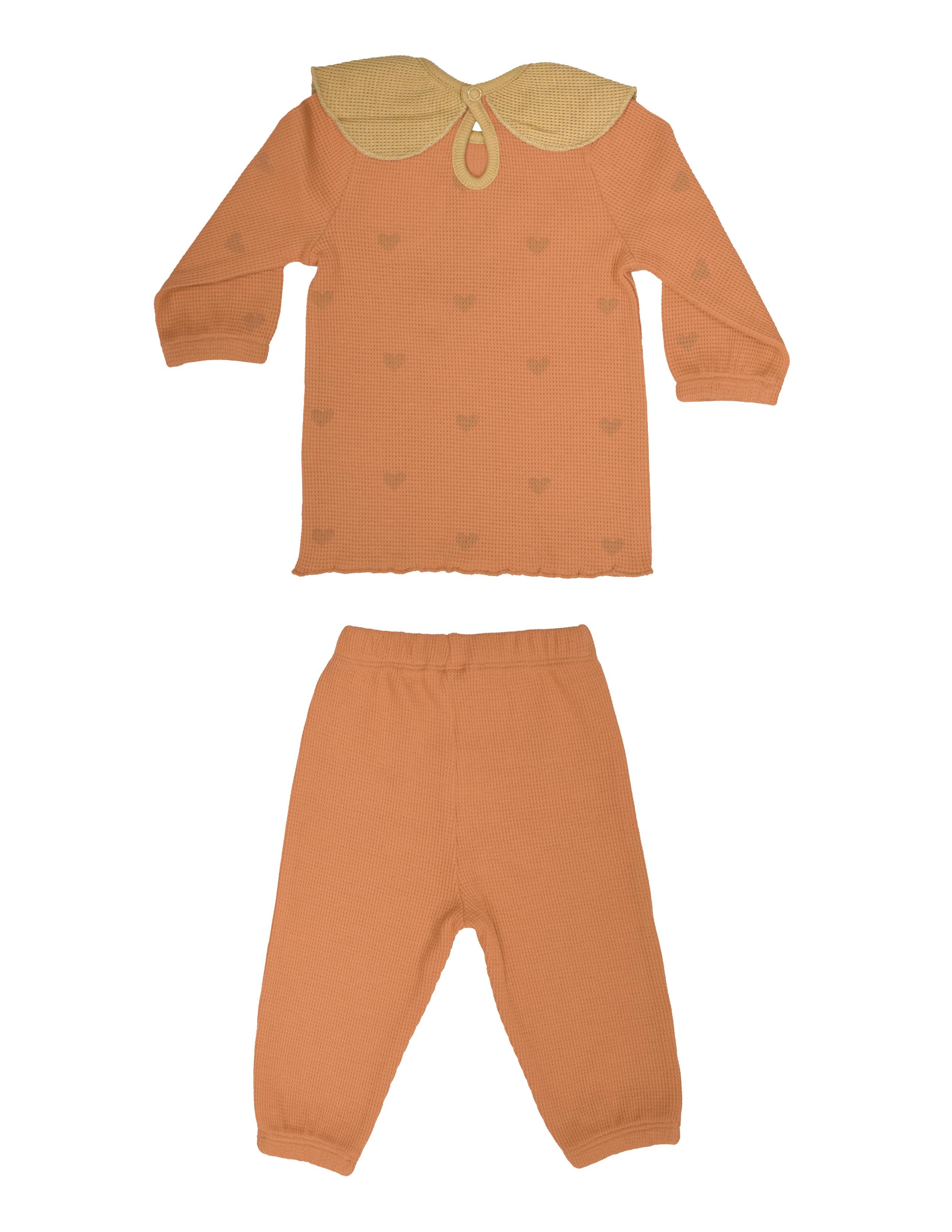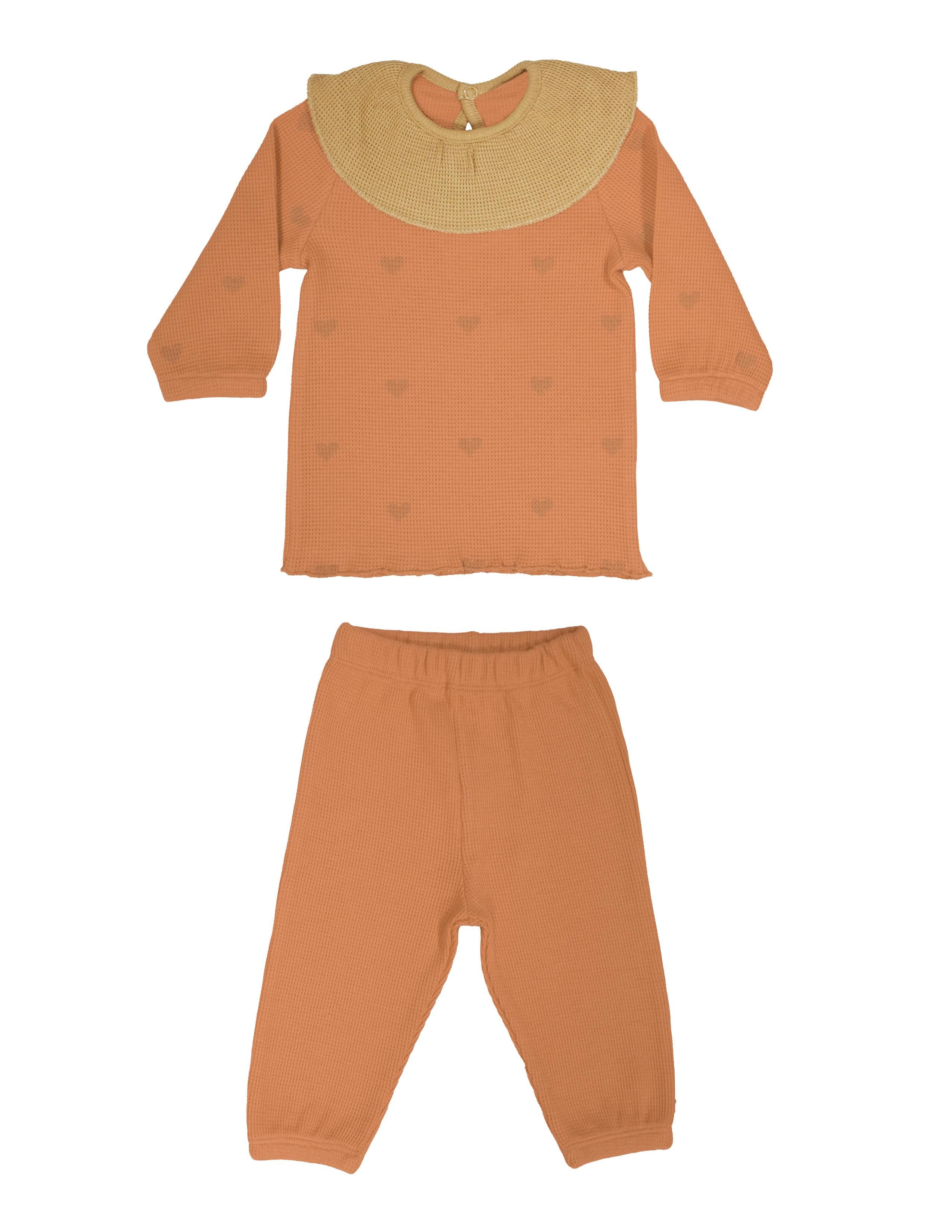 Kiremit baskılı,bebe yaka, uzun kollu üst ve kiremit alt bebek pijama takımı. GOTS organik sertifikalı waffle kumaş. Maksimum 30°C sıcaklıkta benzer renklerle yıkayınız. Kumaş İçerik: %95 organik pamuk ve %5 elastan.