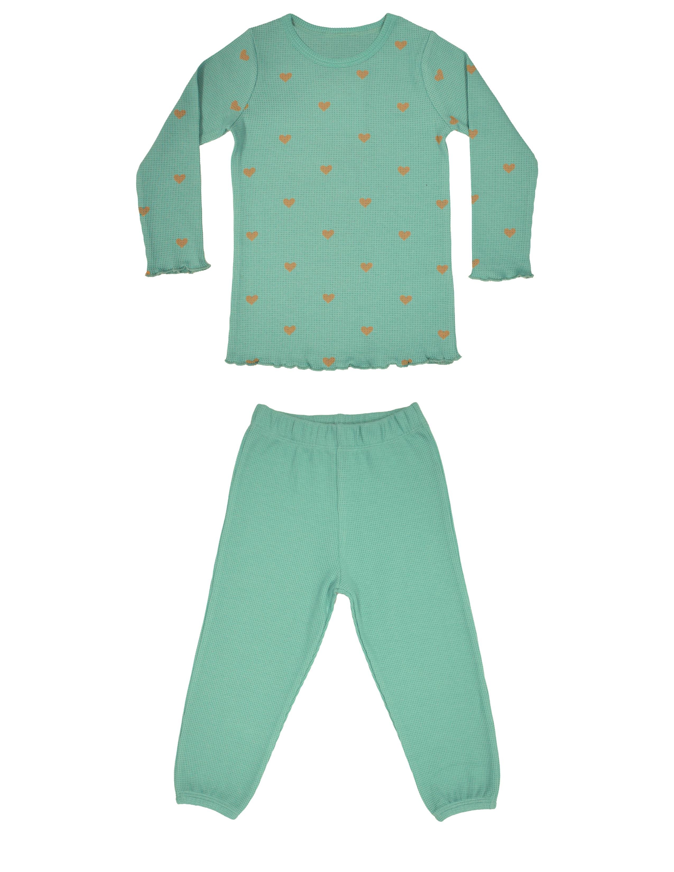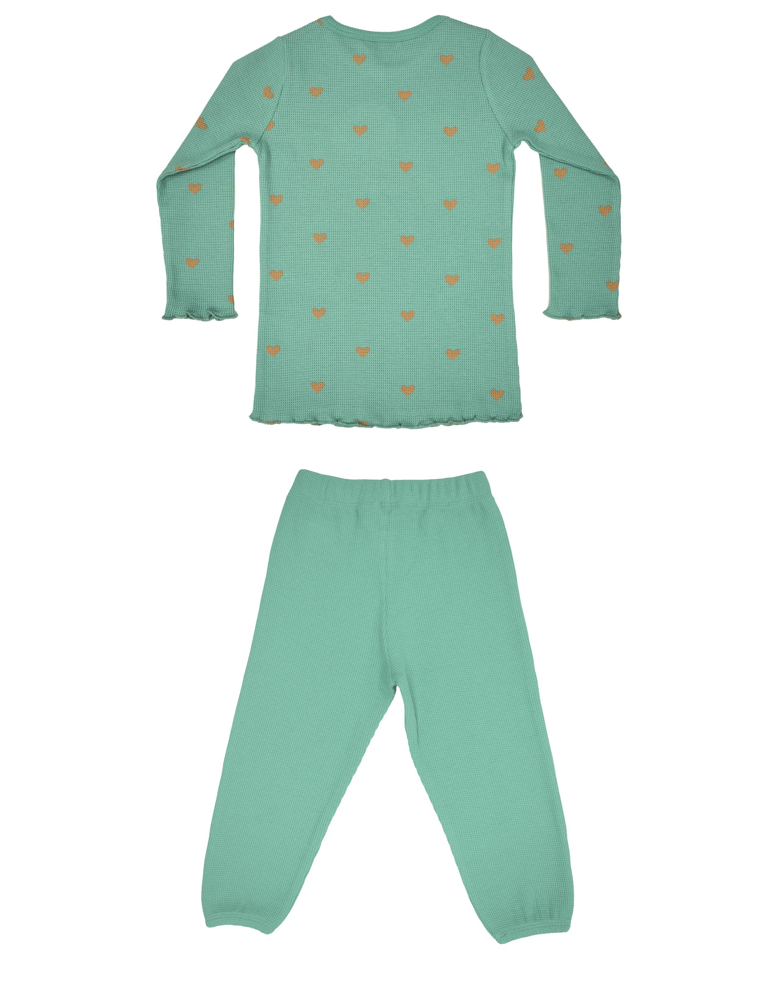 Yeşil,baskılı,basic yaka uzun kollu üst ve yeşil alt takım. GOTS organik sertifikalı waffle kumaş. Maksimum 30°C sıcaklıkta benzer renklerle yıkayınız. Kumaş İçerik: %95 Organik Pamuk ve %5 Likra.