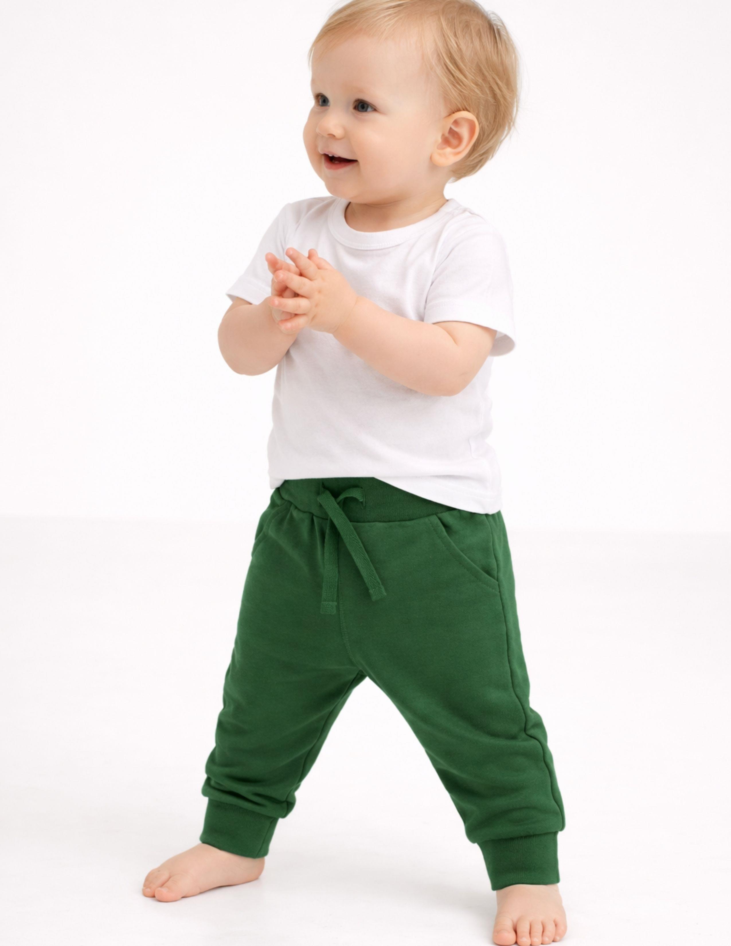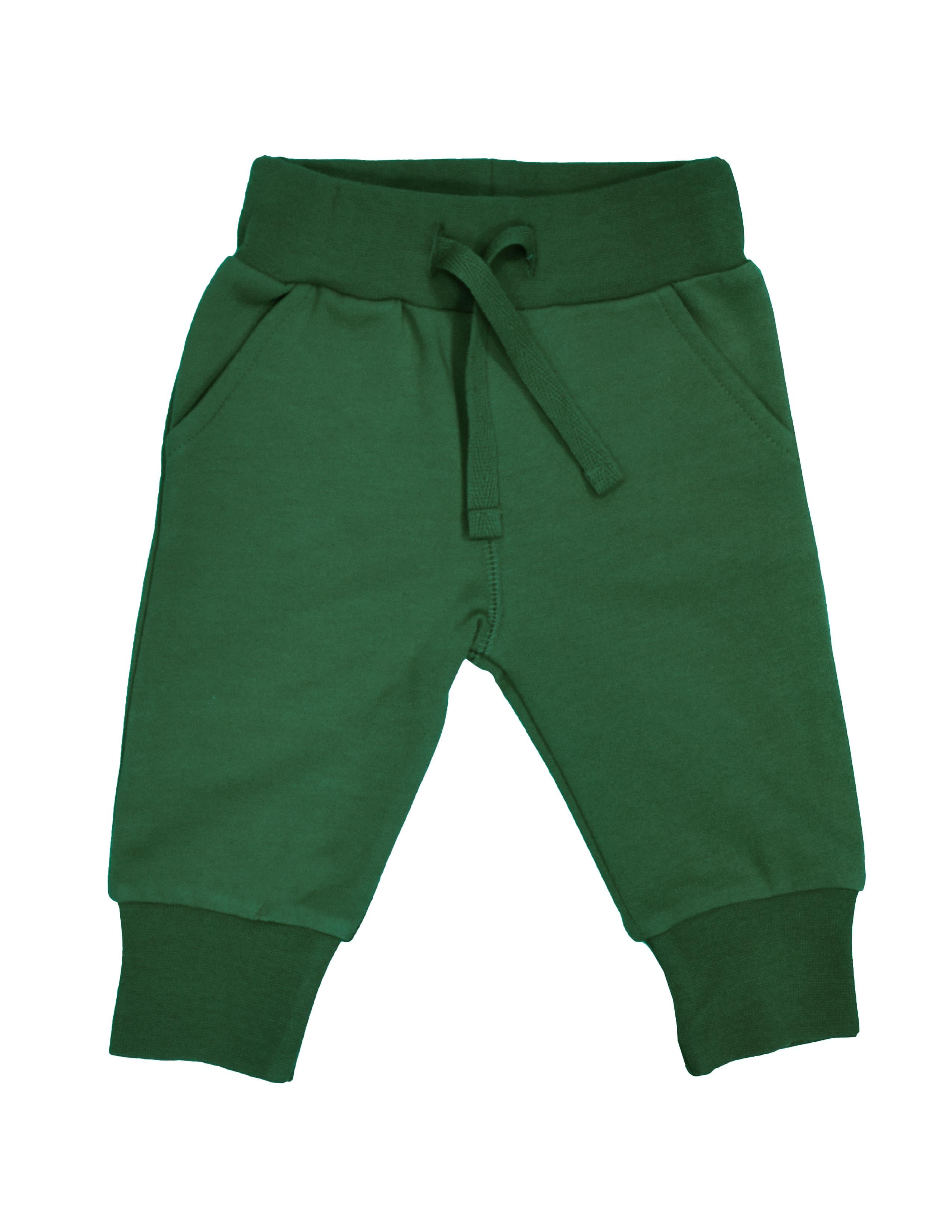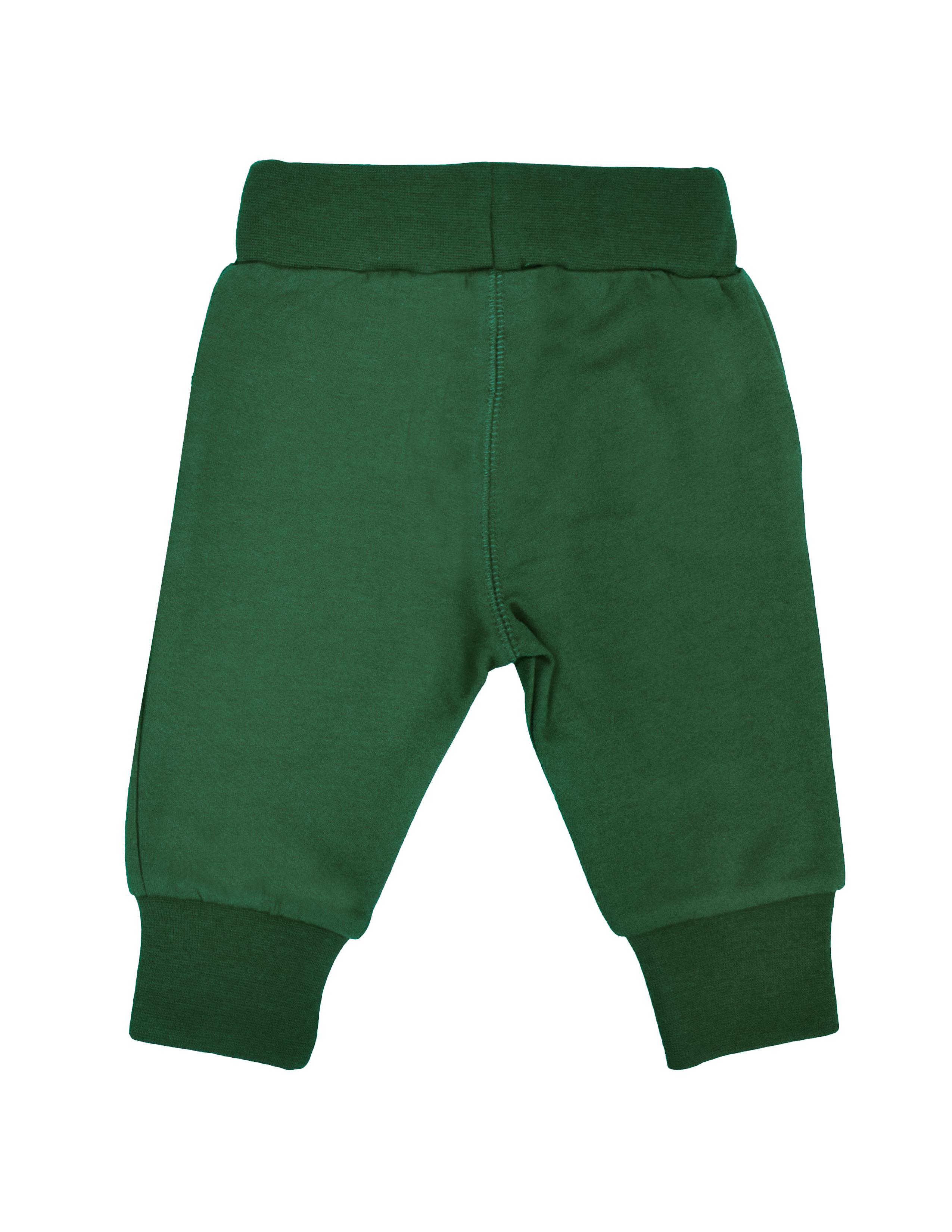 Yeşil beli lastikli ve cepli bebek pantolon. GOTS organik sertifikalı 2 iplik kumaş. Maksimum 30°C sıcaklıkta benzer renklerle yıkayınız. Kumaş içerik: %95 organik pamuk ve %5 elastan.