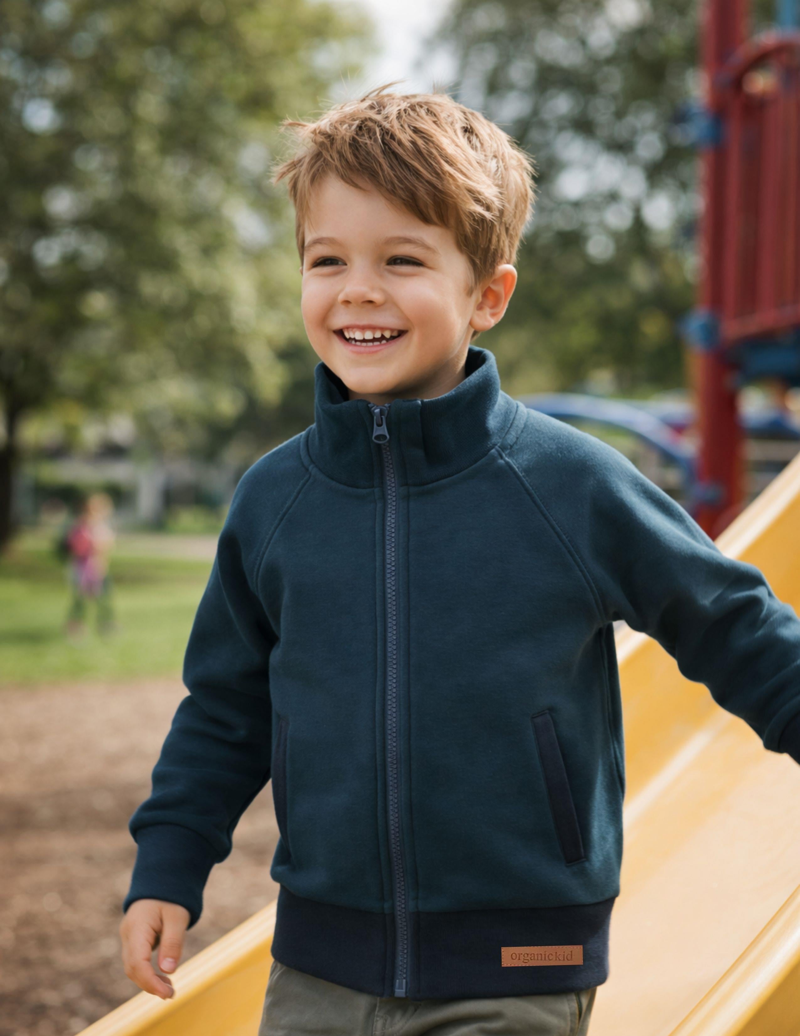 Lacivert, dik yaka, fermuarlı ve önden cepli sweatshirt. GOTS organik sertifikalı 2 iplik şardonlu kumaş. Maksimum 30°C sıcaklıkta benzer renklerle yıkayınız. Kumaş İçerik: %95 organik pamuk %5 lycra.
