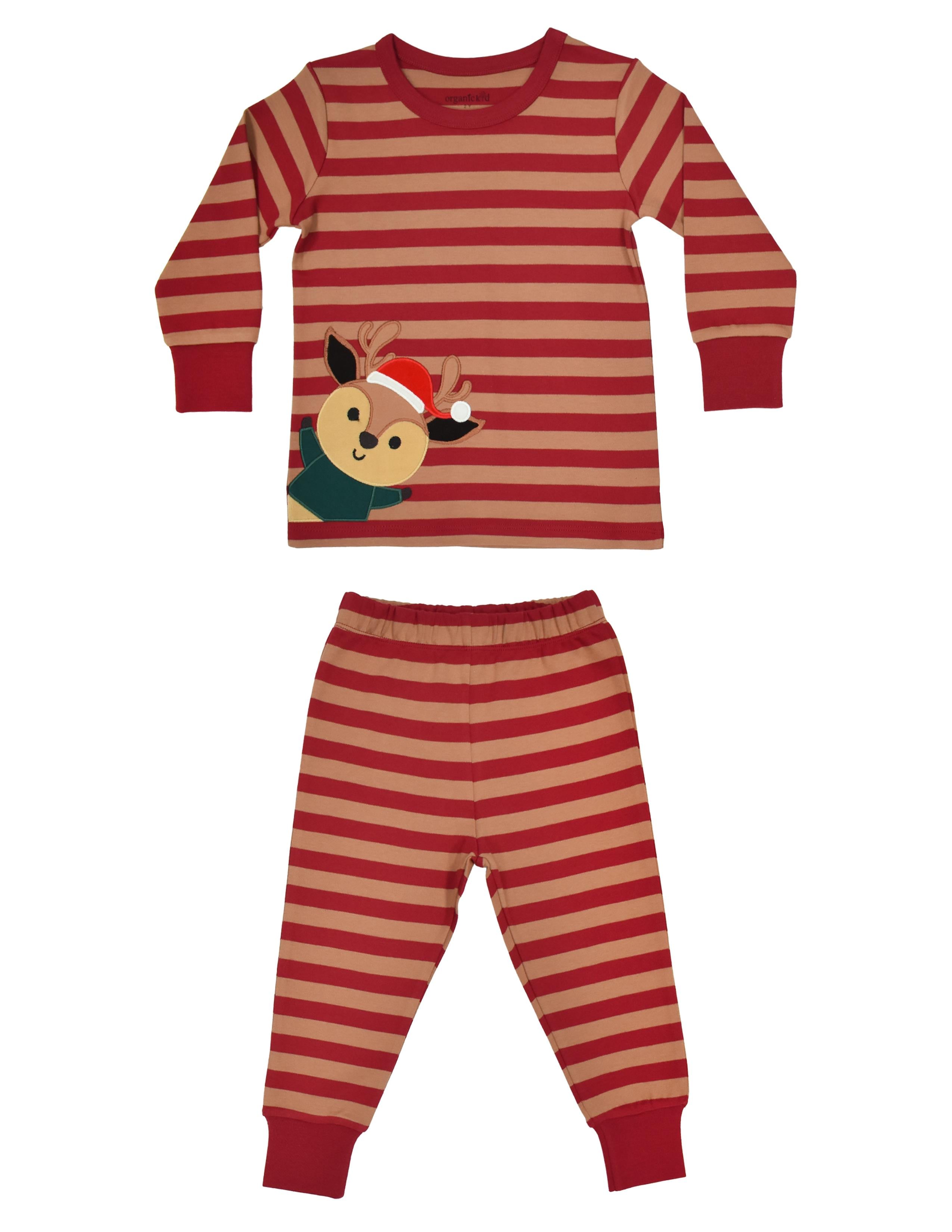 Bordo/kahve çizgili,nakışlı,basic yaka, uzun kollu üst ve alt çocuk pijama takımı. GOTS organik sertifikalı İnterlok kumaş. Maksimum 30°C sıcaklıkta benzer renklerle yıkayınız. Kumaş İçerik: %100 organik pamuk.