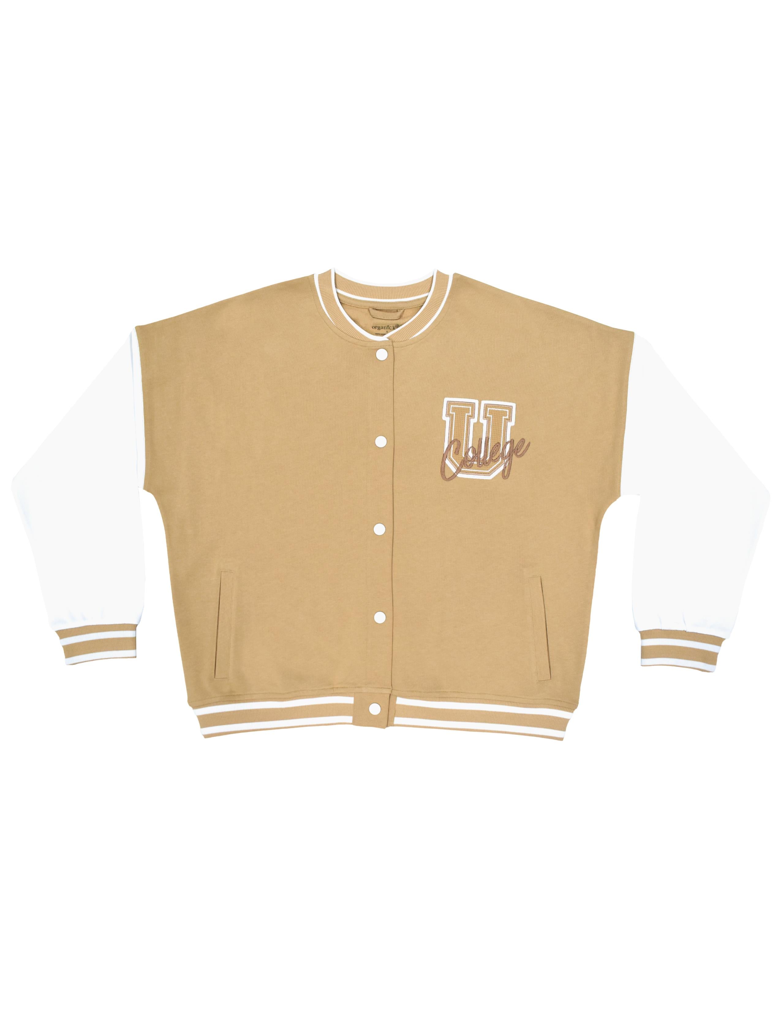 Bej, cepli kadın bomber ceket. GOTS organik sertifikalı 3 iplik kumaş. Maksimum 30°C sıcaklıkta benzer renklerle yıkayınız. Kumaş İçerik: %100 organik pamuk.